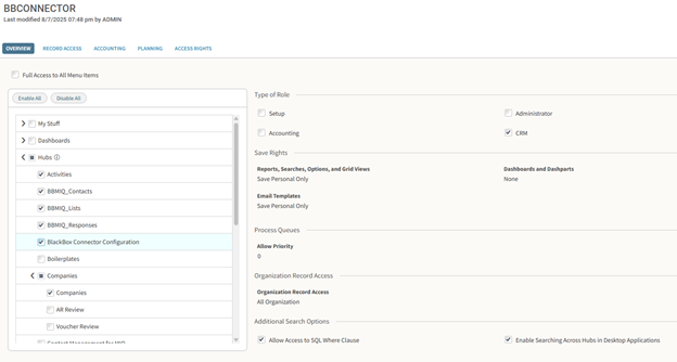 - Lookup or Create the BBConnector Role with the following permissions: