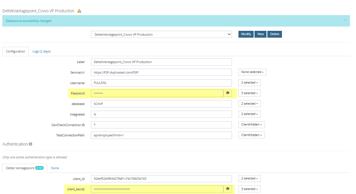 This is also where you would update the client secret if your API authorization in Vantagepoint gets reset.